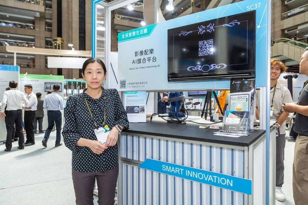 ▲愛飛媒平公司展出「A.V. Mapping 一站式 AI 影像配樂和音樂授權平台」,採全球首創 AI 雙向媒合技術。 吳榮邦/攝影。