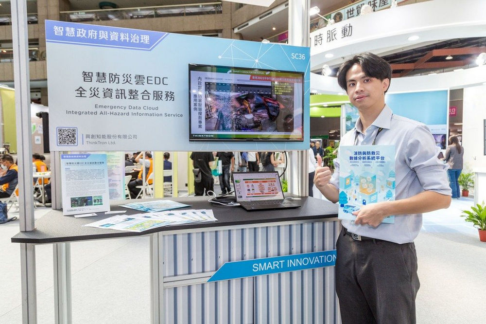 ▲興創知能公司展出「智慧防災雲 EDC 全災資訊整合服務」,是智慧政府與資料治理領域的代表。 吳榮邦/攝影。